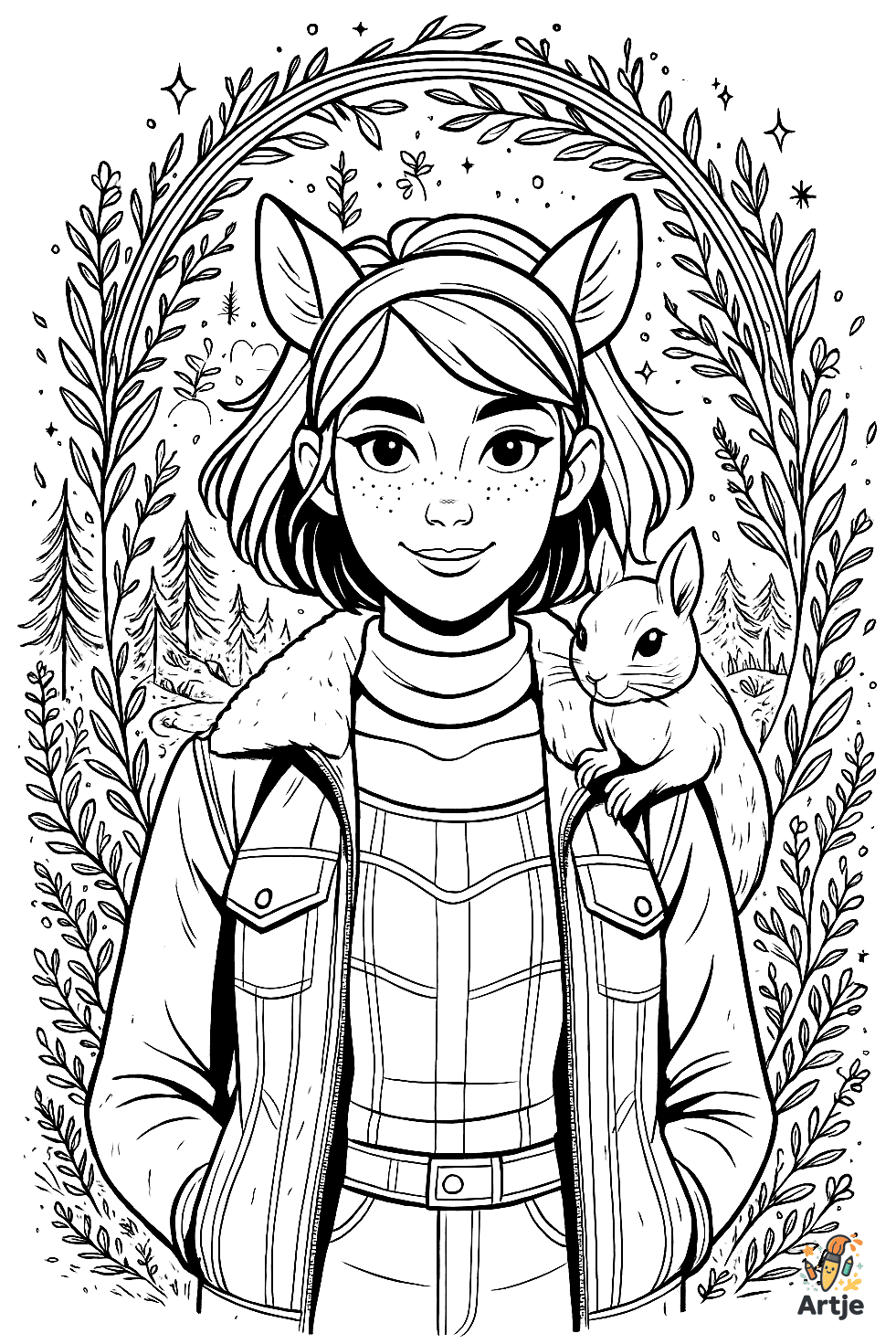 Ein junges Mädchen mit Eichhörnchen steht lächelnd in der Natur, eingerahmt von Zweigen und Blättern – auf ihrer Schulter sitzt ein neugieriges Eichhörnchen. Beide blicken freundlich, fast vertraut, und wirken wie echte Freunde. Der Hintergrund zeigt Wälder, Sterne und feine Pflanzenornamente, die dem Bild eine märchenhafte Note verleihen.