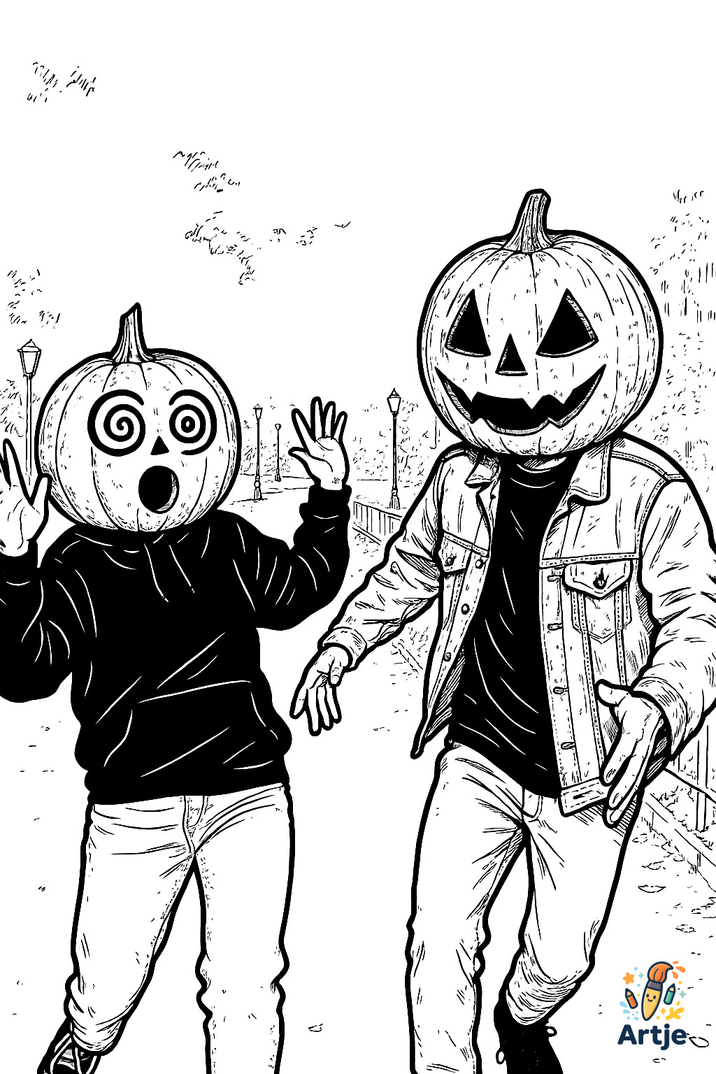 Zwei Typen mit Kürbisköpfe? Dieses Ausmalbild zeigt zwei Figuren, deren Köpfe aus geschnitzten Kürbissen bestehen. Einer lacht freundlich, der andere wirkt mit wirbelnden Augen erschrocken. Sie laufen durch eine von Laternen beleuchtete Allee, die der Szene eine geheimnisvoll-verspielte Stimmung verleiht. Die unterschiedlichen Gesichtsausdrücke der Kürbisse machen die Darstellung humorvoll und fantasievoll.