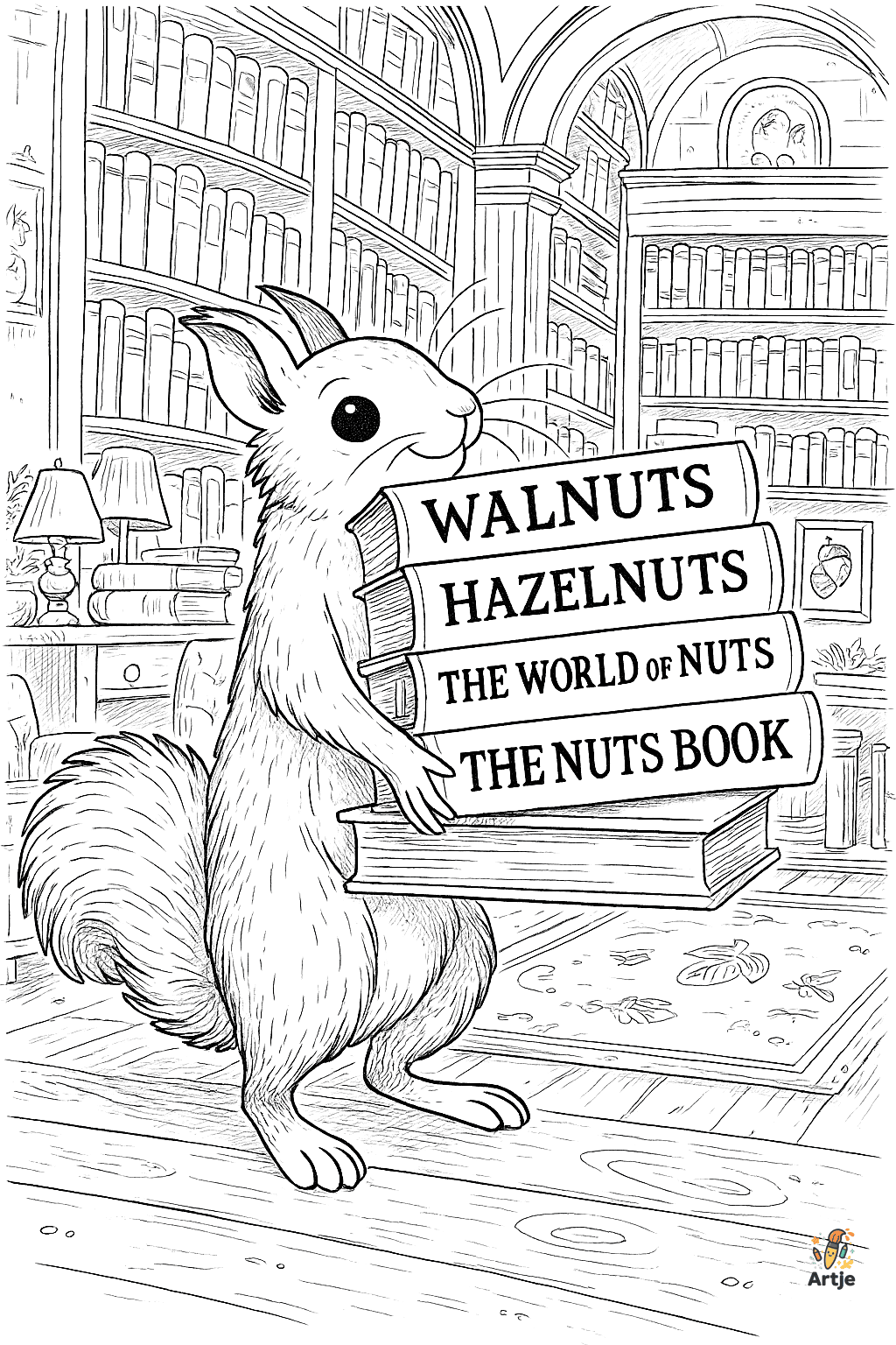 Zwischen hohen Bücherregalen, deren Regalböden bis zur Decke reichen, steht das Tier aufrecht und balanciert mehrere dicke Bücher in seinen Pfoten. Auf den Buchrücken sind Titel wie “Walnuts”, “Hazelnuts”, “The World of Nuts” und “The Nuts Book” zu lesen – ein humorvoller Hinweis auf das Lieblingsthema des kleinen Forschers. Sein buschiger Schwanz kringelt sich stolz hinter ihm, während seine großen runden Augen aufmerksam und eifrig wirken.