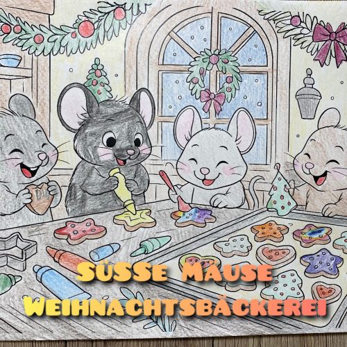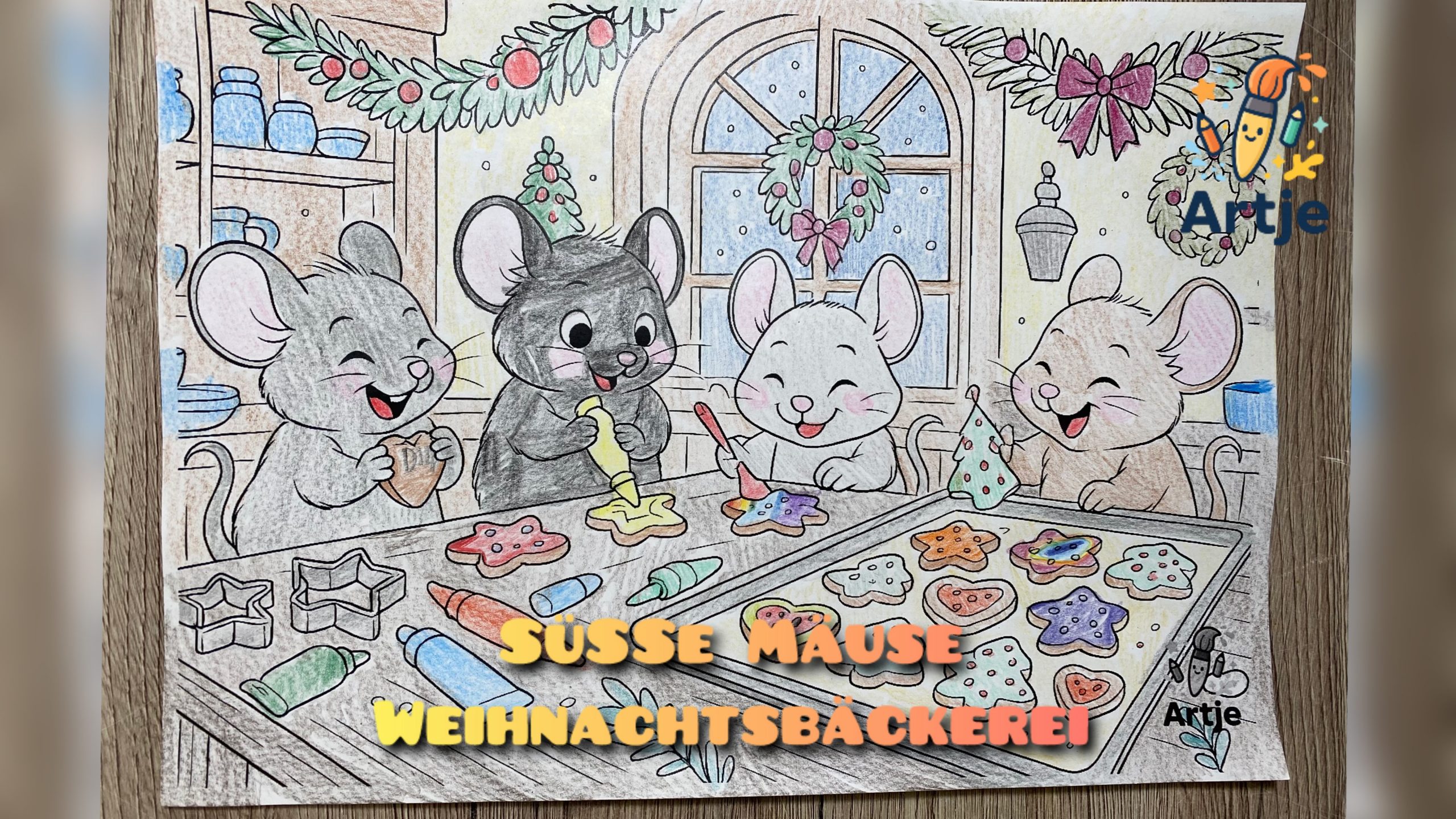 Die kleine Mäuse-Weihnachtsbäckerei ist in vollem Gange: Vier fröhliche Mäuse verzieren bunte Plätzchen, formen Teig und lachen zusammen, während draußen leise Schnee fällt. Die warmen Farben der Buntstifte lassen die Szene gemütlich und lebendig wirken. Im Video zeige ich Schritt für Schritt, wie man die Figuren, das Gebäck und die winterliche Küche harmonisch koloriert, damit das Bild am Ende wirkt, als würde man direkt mit den Mäuschen backen.
