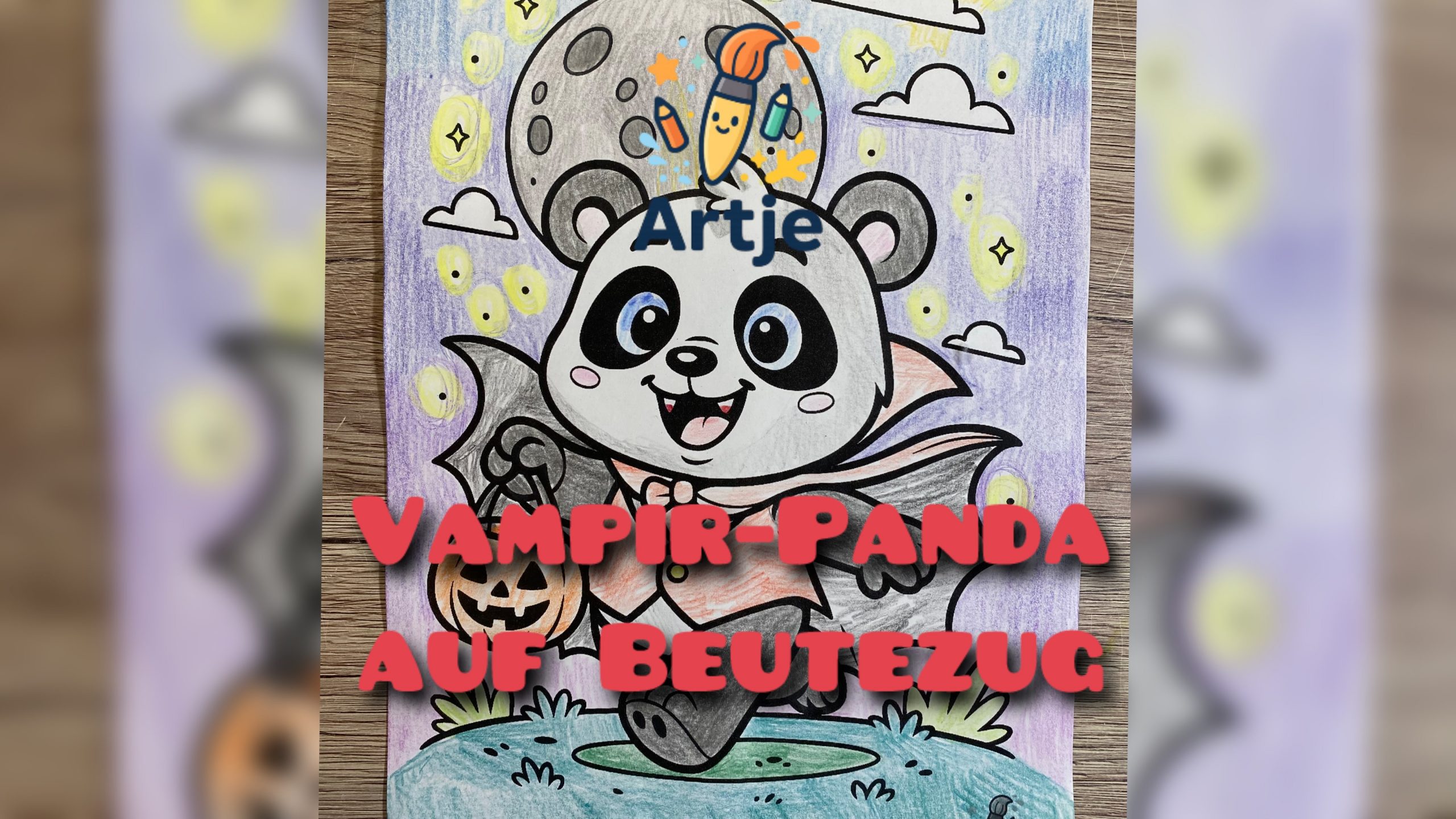 Ausmalbild: Panda als Vampir Dieses Ausmalbild zeigt einen kleinen Panda, der als Vampir verkleidet durch die Nacht spaziert. Mit Cape, Schleife und einem Kürbis-Eimer in…